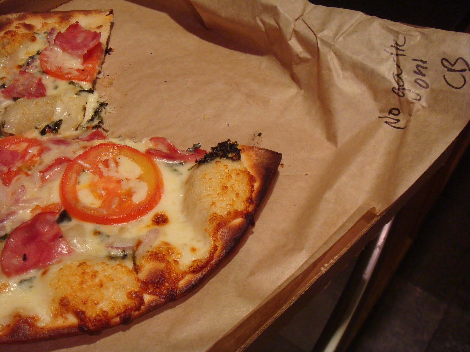 Ty ordered the Calexico. Mozzarella, Gorgonzola, Chicken, "HOT" buffalo sauce, and Jalepeno. The buffalo sauce must have had a little sugar in it, because I could really taste something sweet. Not may favorite pizza, but I've never liked the idea of BBQ anything on pizza. Yuck.
